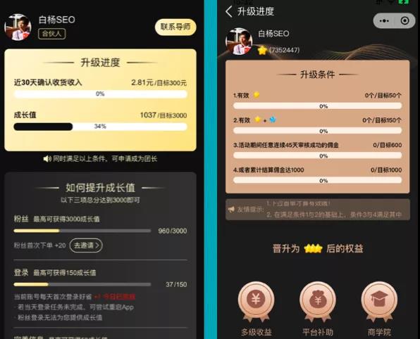 3、代理组长、团长、总代等。这里一般指的是上下级。举例说明吧。比如,白杨呢拿到了好省(一个APP)码,下面人A通过白杨的码注册就是白杨下面的了,而下面的人A再去推广别的人B注册,B就是A的下面了。当你达到要求就会往上升。如两张图: