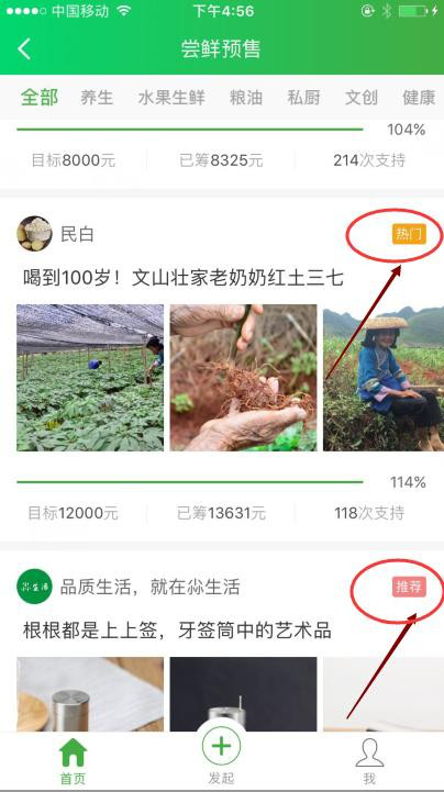 大家点开这个“尝鲜预售”看一下里面内容,都是众筹一些水果生鲜了、养生产品之类的。其中第一个是置顶的、后面几个是热门内容,热门下面就是被推荐的内容:
