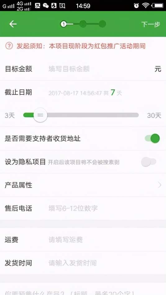 首先我们可以先设置一个比较合理的价格来众筹。比如说我们要筹的金额目标是一万,但是我们前面可以先设置5000,等筹到了5000之后我们在提高众筹的资金。这个在后台是可以更改价格的。