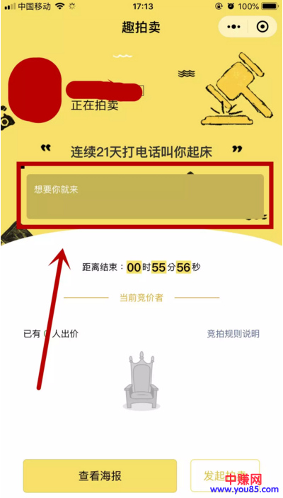 这一个文案点开竞拍小程序就能看到,对竞拍的成功与否有着重要的辅助作用,所以我们要好好利用。文案有字数限制,要在12个字内准确的说出自己想说的话,因为大家需求不一样,大家根据自己的情况出发,我就不举例说明了,文案要撩人一点,勾起用户的需求基本就ok了。