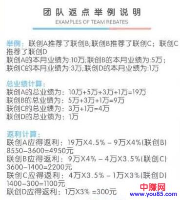 简单地说,就是按照团队总业绩金额来返点,业绩越高返点越高,如图。你的下级也是联创,那么就要你团队所有返利金额减去你下级的返利金额才是你最后的收入。