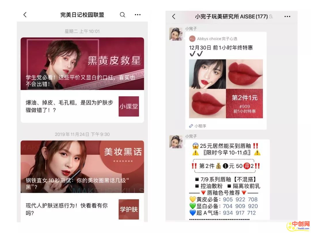 a、公众号:完美日记的公众号内容不像李佳琦、薇娅那样单一,绝大部分都在做预告。